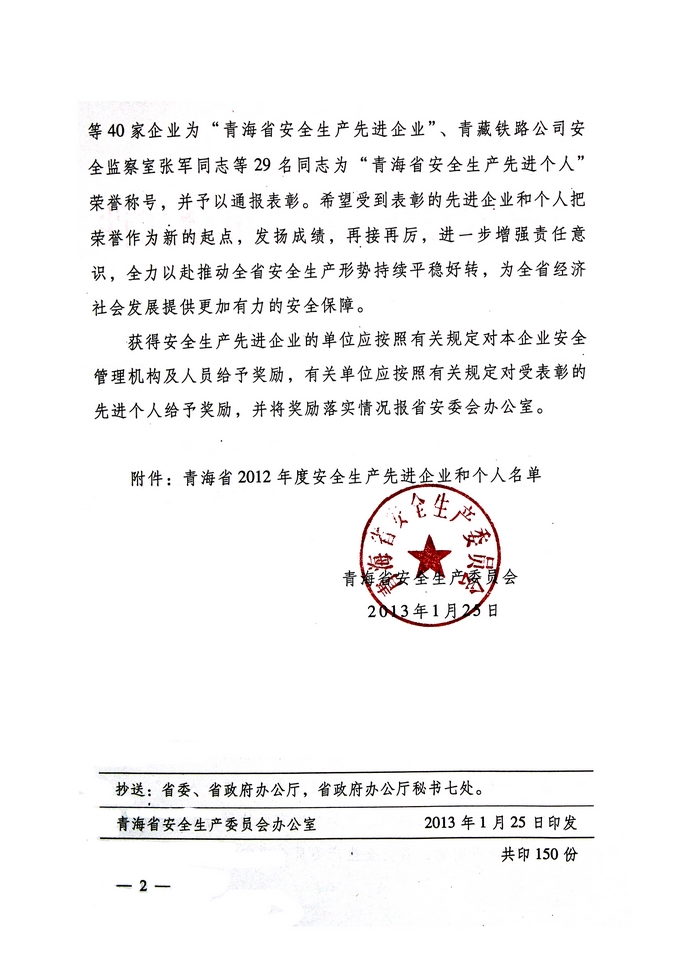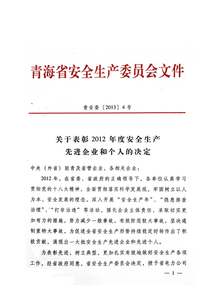 2012年,在省委、省政府的正確領(lǐng)導(dǎo)下,青海省物產(chǎn)集團(tuán)總公司認(rèn)真學(xué)習(xí)貫徹黨的十八大精神,全面貫徹落實(shí)科學(xué)發(fā)展觀(guān),牢固樹(shù)立以人為本、安全發(fā)展的理念,深入開(kāi)展"安全生產(chǎn)年"、"隱患排查治理"、"打非治違"等活動(dòng),為促進(jìn)全省安全生產(chǎn)形勢(shì)持續(xù)穩(wěn)定好轉(zhuǎn)做出了積極貢獻(xiàn)。為此,經(jīng)省政府同意,省安全生產(chǎn)委員會(huì)決定授予青海省物產(chǎn)集團(tuán)總公司"2012年度安全生產(chǎn)先進(jìn)企業(yè)"榮譽(yù)稱(chēng)號(hào)。